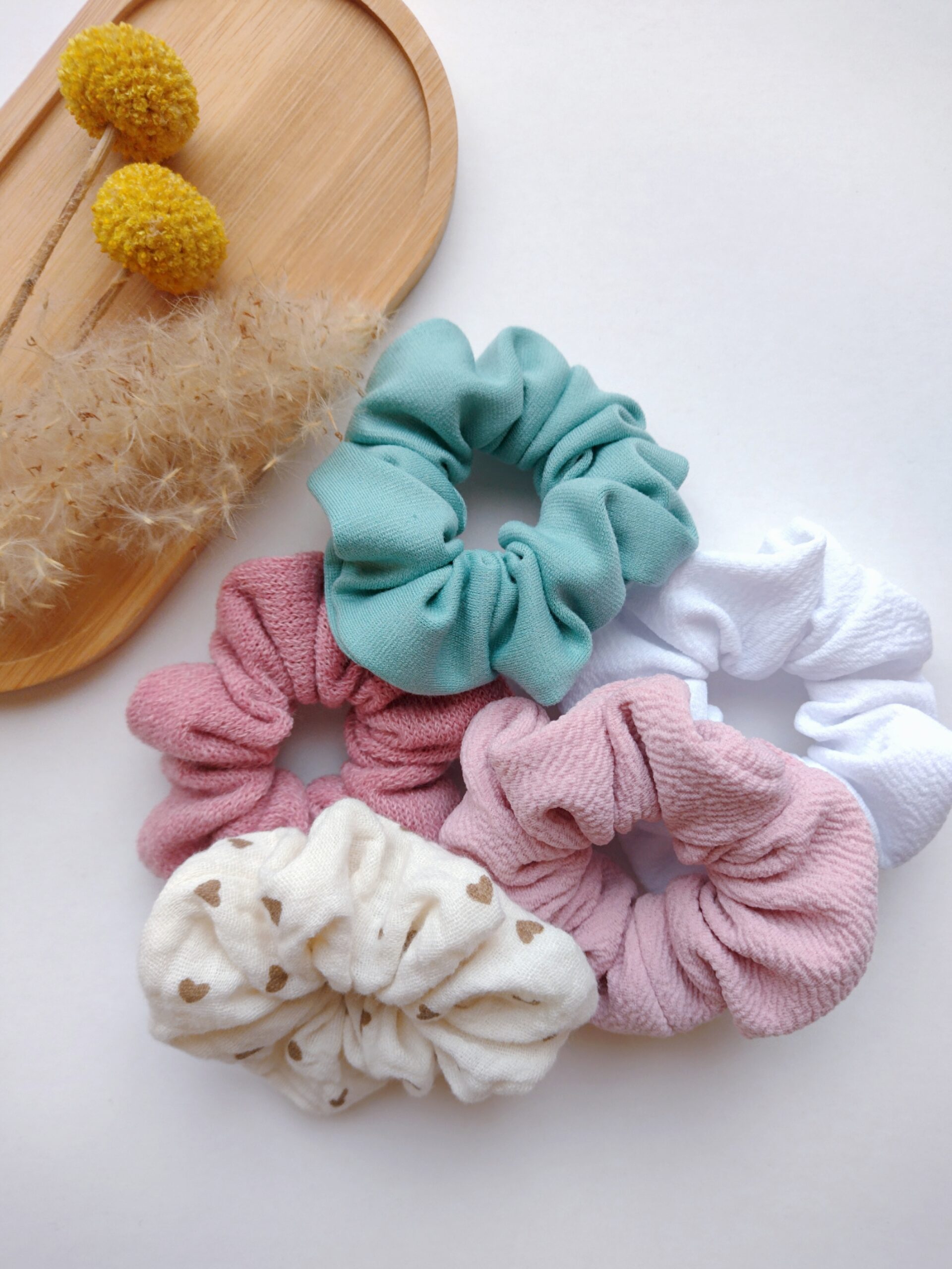 Set de mini scrunchies – tonos suaves con estampado de corazón