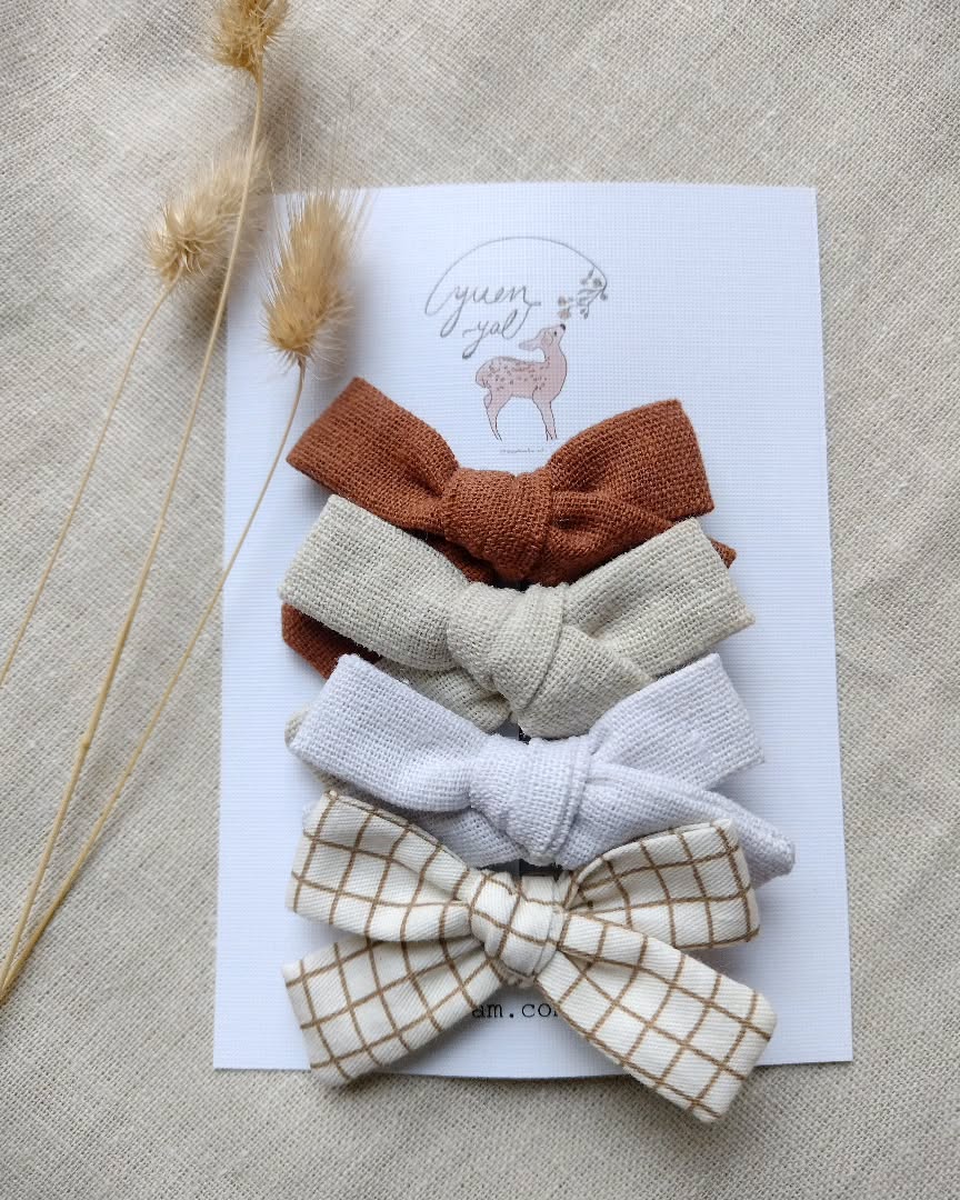Delicado set de 4 lazos en suaves tonalidades marrón, perfecto para complementar peinados con estilo y calidez.